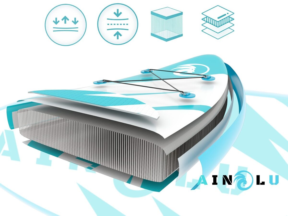 Доска AINOLU RIPTIDE изготовлена из высококачественного материала Drop-Stitch, благодаря чему она становится жесткой и устойчивой после накачивания.